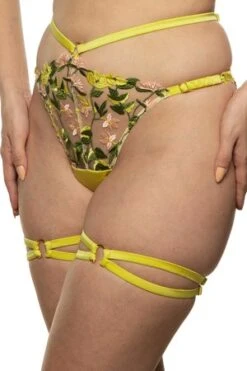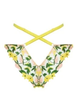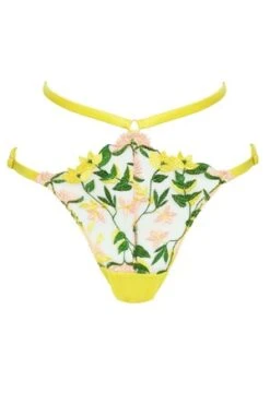 Thats right, lovely Liana has returned from the archives like Persephone bringing spring to us earthlings upon her annual return from the Underworld. The delicate floral embroidery on illusion tulle is framed by criss-crossing chartreuse silk waist strap details, guiding the eye across the body. The Liana Waist Strap Knicker is a cheeky, Brazilian-style brief that features panels of embroidered tulle delicately enveloping your curves with vibrant vines and florals. We recommend pairing with the matching bralette for a complete, bold, look.