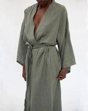 Our Linen Robe, comprised of French linen, is a Japanese-inspired, full length Kimono-style statement piece. The robe has hidden, low-hanging pockets on the side seams and is one size fits most (0-16).