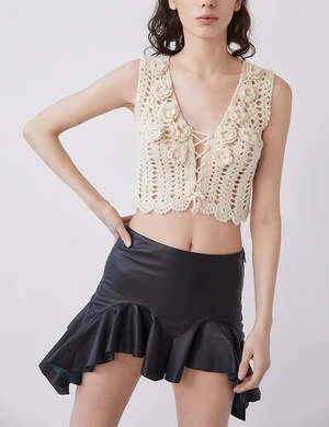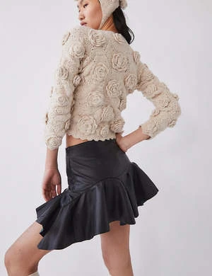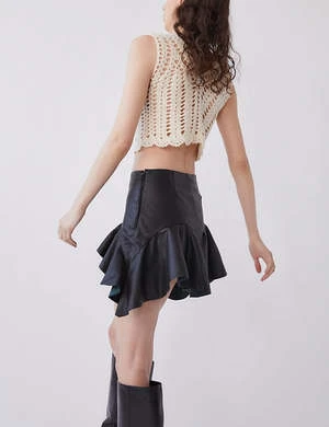 Imagine taking yourself on a date in this perfect leather mini with ruffles. Style it with a cute knit top, crisp white blouse or old tee for a cool and sexy look. So darling.