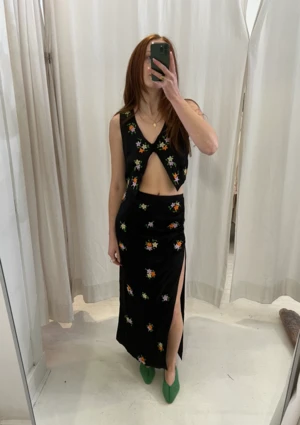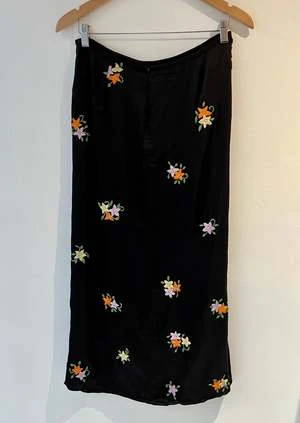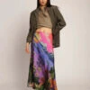 The Scarlett Skirt by Tach is a satin embroidered skirt featuring a draped side detail and slit for easy movement.