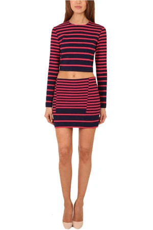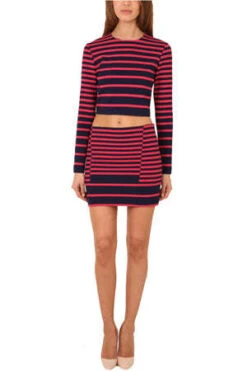 Right on trend, this striped mini comes with a chic mod striped print. A fitted silhouette & a striped front flap illusion give it edge. Looks amazing paired with its crop top companion.
