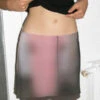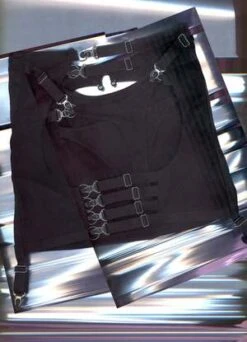 100% organic cotton backless mini skirt with detachable thong in the back. Comes with signature circular barbell and adjustable elastic straps with garter clips at the back.