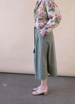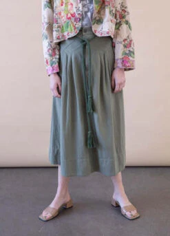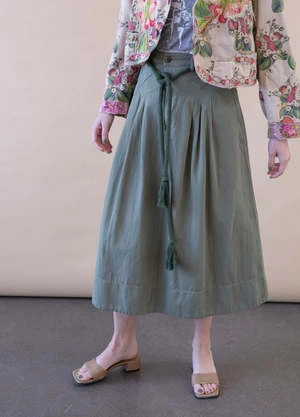 The Great “The Field” midi skirt featuring a paneled waist and pleated front in colored denim. Side slip pockets, high rise and Circle-cut silhouette. Hem falls below the knee. Button / zip fly; belt loops.