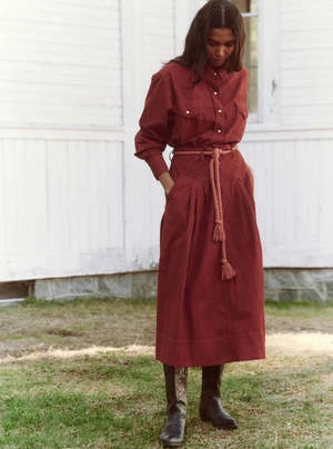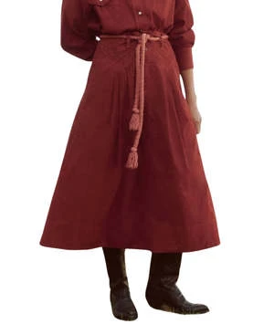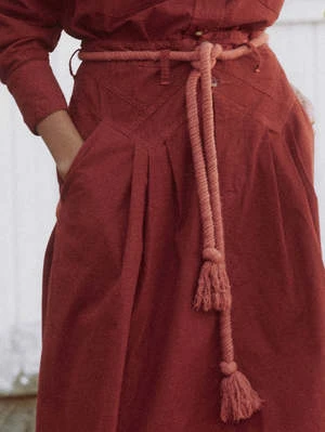 The Field Skirt. is a wear-everywhere staple. This flowy piece hits at the low calf and is cut from a baby wale cord in an earthen palette of garment-dyed colors with beautiful highs and lows reminiscent of Fall landscapes. A cotton rope belt ties at the natural waist for a flattering effect. Wear yours with the matching The Heritage Shirt. for the kind of head-to-toe look we love.