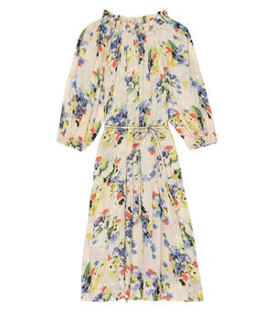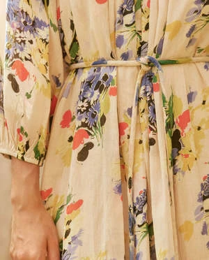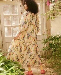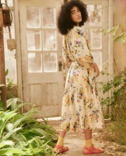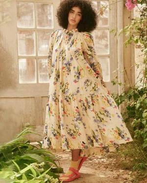The Victorian Dress in Bright Grove Floral by The Great. is a midi length, tiered dress featuring billowy sleeves, waist tie, and ruffled neckline.
