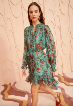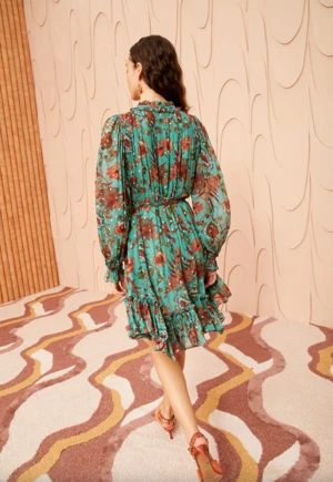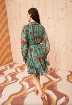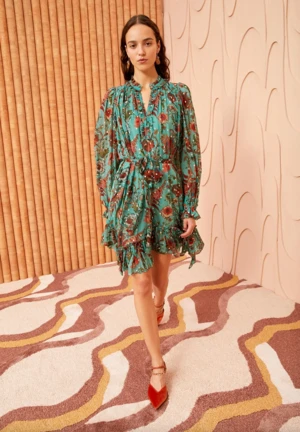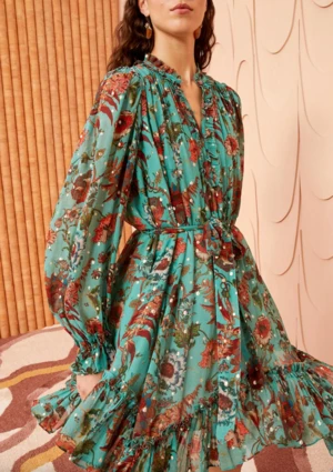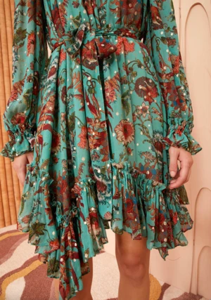 Made from crinkle chiffon, the Anais Dress is a green frock with shimmering lurex dots and floral vines inspired by vintage botanicals. This long-sleeve mini dress features delicate ruffle trims, an asymmetric hemline, and a self-tie belt. It fastens with a partial button-front closure.