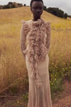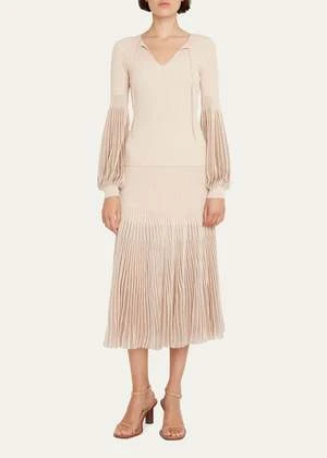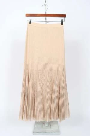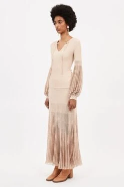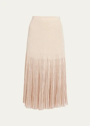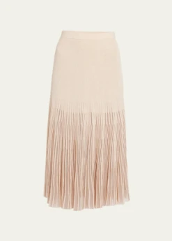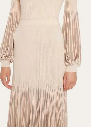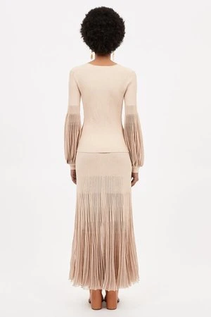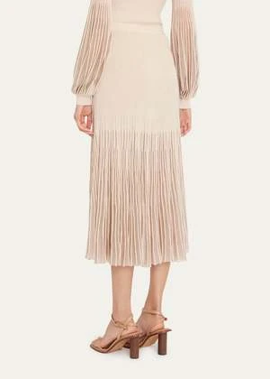 The Emilia Skirt languidly skims your silhouette thanks to its ultrafine knit constructionits spliced with sheer vertical stripes, evoking elegant sunburst pleating that unfurls to a stunning hemline. This blush-hued skirt features a midi hemline that bursts with shimmering bronze lurex.