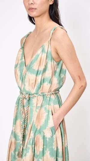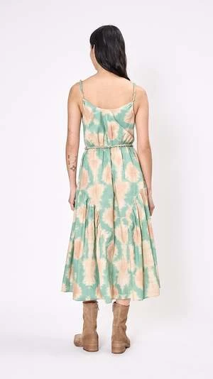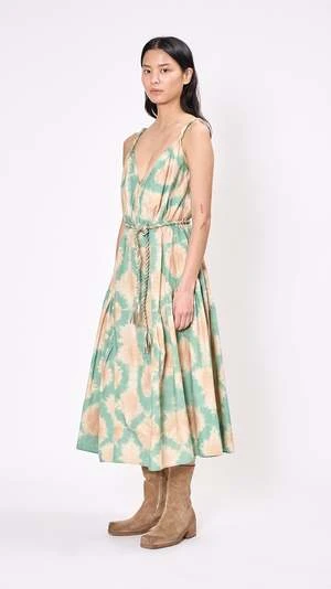 The Valentina Dress has a relaxed bodice with a voluminous midi-skirt constructed from shibori-inspired cotton poplin. It features hand-twisted straps, a twisted removable belt, side pockets, and a side seam zipper.