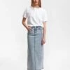 Denim is imbued with added drama for the new season. The low-rise Godet Denim Skirt has a floor-length hemline and centre split to the front, with an asymmetric finish to the rear. Raw-edge detailing creates a utilitarian finish.