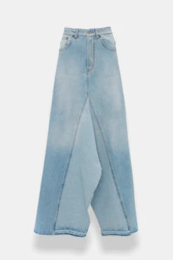 Denim is imbued with added drama for the new season. The low-rise Godet Denim Skirt has a floor-length hemline and centre split to the front, with an asymmetric finish to the rear. Raw-edge detailing creates a utilitarian finish.