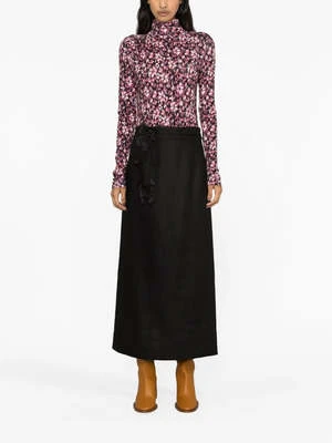 Zimmermann’s Luminosity Pencil Skirt from their Fall 2023 Collection, Luminosity, is a linen midi skirt featuring a removable floral belt.