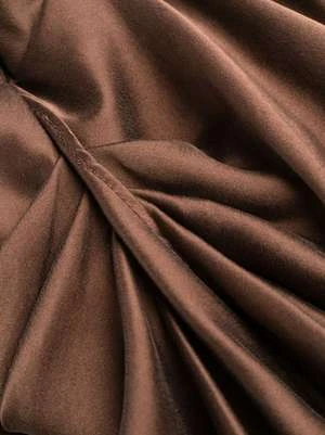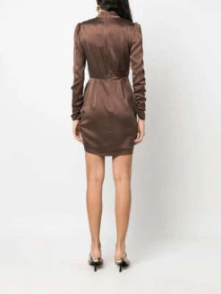 Zimmermann’s Silk Drape mini dress in chocolate brown featuring draped detailing, high neck and concealed rear zip fastening.