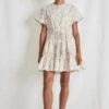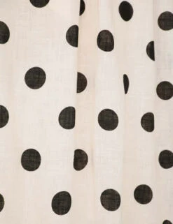 Zimmermann’s V Neck Midi Dress in Cream/Black Dot from their Resort 2024 Collection, Matchmaker. A linen midi dress featuring short sleeves and a plunge neckline, finished with a drape detail along the waist.